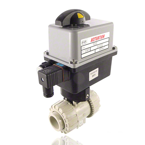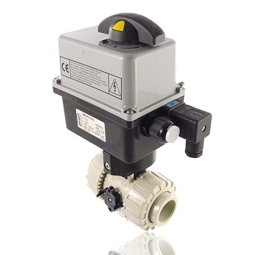 2/2-Wege-Kugelhahn mit gesicherten Überwurfmuttern aus PP mit elektrischem Stellantrieb