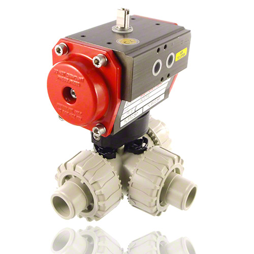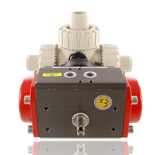 | 3-Wege-Kugelhahn aus PP mit pneumatischem Stellantrieb Funktion: doppelt wirkend, inklusive optischer Stellungsanzeige Kugel mit T-Bohrung Standardkugelstellung: 1 Steuerdruck: Standard 5 bar reduzierter Steuerdruck: auf Anfrage Steueranschluß: G 1/8' Namur (DN15) G 1/4' Namur (DN20 - DN50) Anschluss: Schweißstutzen zum Heizelementmuffenschweißen Dichtung PTFE/FPM |