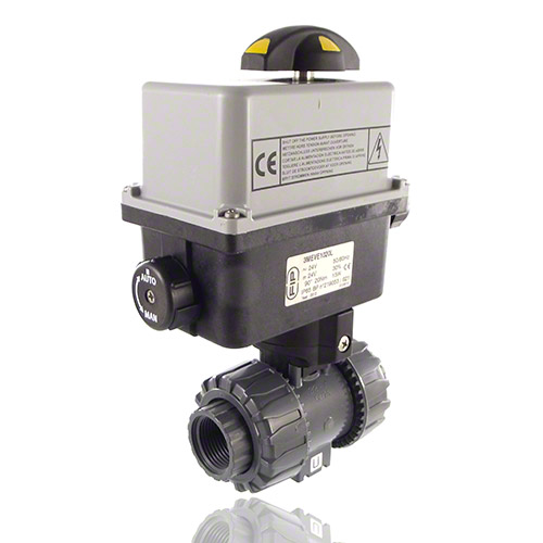 | 2/2-Wege-Kugelhahn mit gesicherten Überwurfmuttern aus PVC-U mit elektrischem Stellantrieb -mit Endlagenrückmeldern, Handnotbetätigung und optischer Stellungsanzeige -Stellantriebsdaten: Standard 90-240V / 50-60Hz (AC), ohne Aufpreis 24V AC/DC -Andere Spannungen auf Anfrage -***DN50 = PN16 auf Anfrage -Anschluss: Gewindemuffen -Dichtung: PTFE/EPDM |